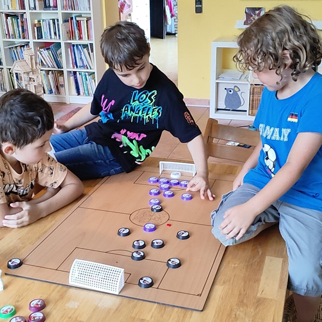 🏟️ Gespielt wird mit kleinen Scheiben (Figuren) auf einem Tischfußballfeld und nach den gleichen Regeln wie beim Fußball (Passen, Tor schießen, Einwurf, Eckball)